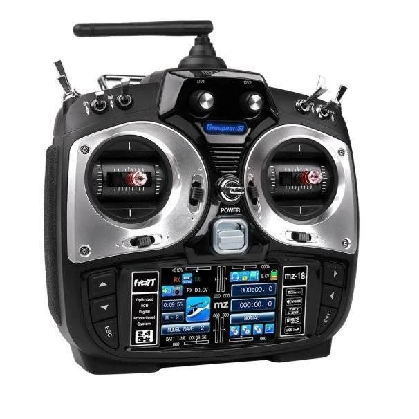 Voice, color and touch is what makes the Graupner mz-18 one of the most versatile radio on the market at a price point unmatched in the industry. With its 12 channels and built-in real-time voice telemetry you will experience a new level of connection between you and your model. Usability is easy with the TFT color and touch screen. Navigating through the basic and function menus is simple with the touch of your finger, stylus or navigation keys.