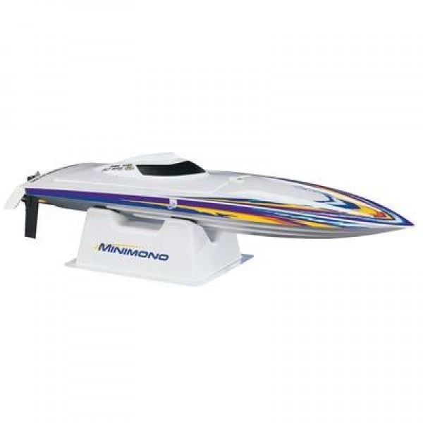 The Minimono Brushless 2.4GHz RTR represents a new breed of boat: a mini-sized model equipped with a brushless motor and an ESC that can use a LiPo battery. Its smaller size and responsive handling let you race on smaller bodies of water, and it’s very affordable to operate too and now comes with the ergonomic, programmable Tactic TTX300 SLT 3-Channel Radio!