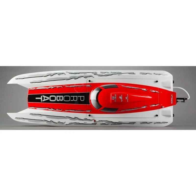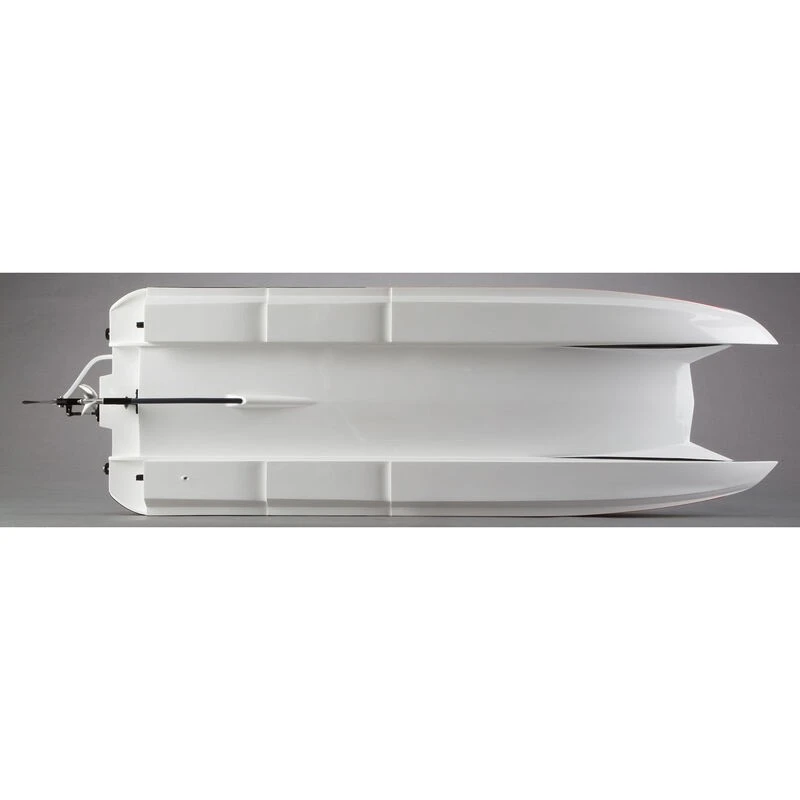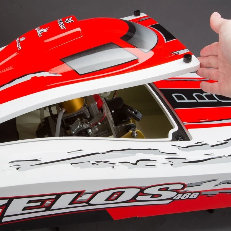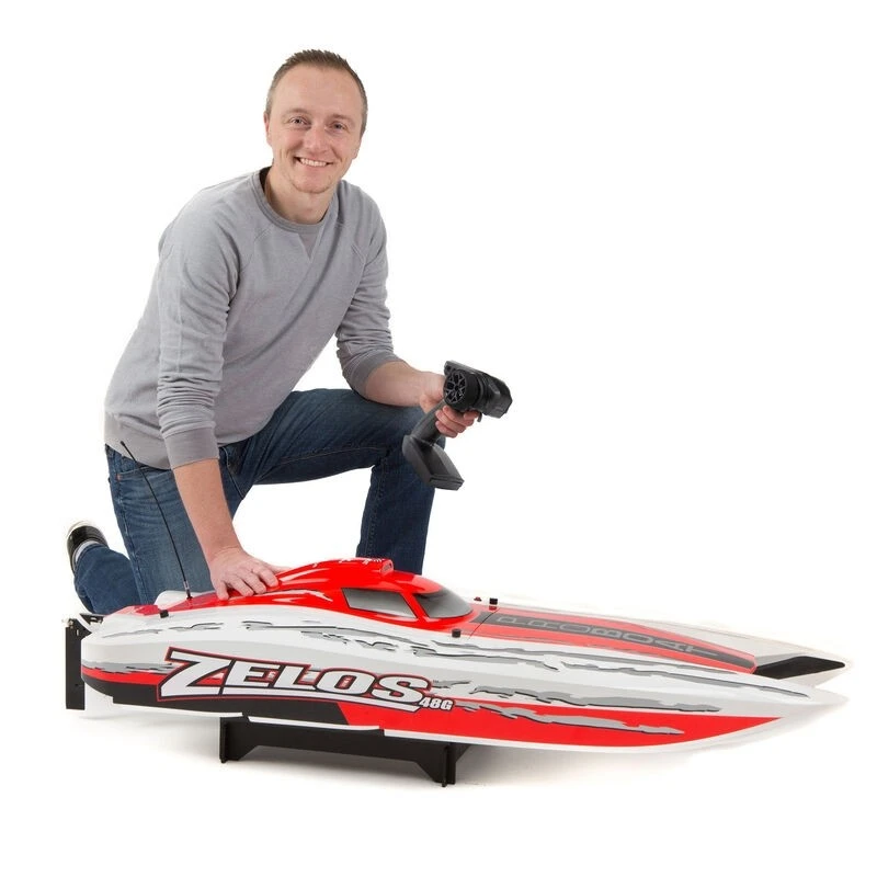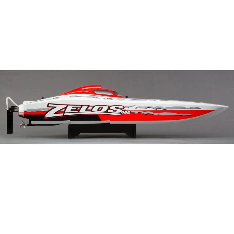 Rip, roar and race like never before with the Zelosâ„¢ 48 Type G Catamaran. This high-speed catamaran is equipped with a Dynamite® Zenoah G300PUM 30cc gas engine capable of a pulse-pounding 50+ miles per hour. By the time the competition knows what hit them; they’ll be eating your wake. The Dynamite Zenoah engine also features an EZ Start system requiring less than half the effort it takes on the average engine to pull the engine starter. The new top deck design resembles the sporty and classic look offered by the Zelos 36. A new trim scheme finishes off the look and ensures the boat looks as fast sitting on the shelf as it does on the water. Make some waves with the Zelos 48 Type G.