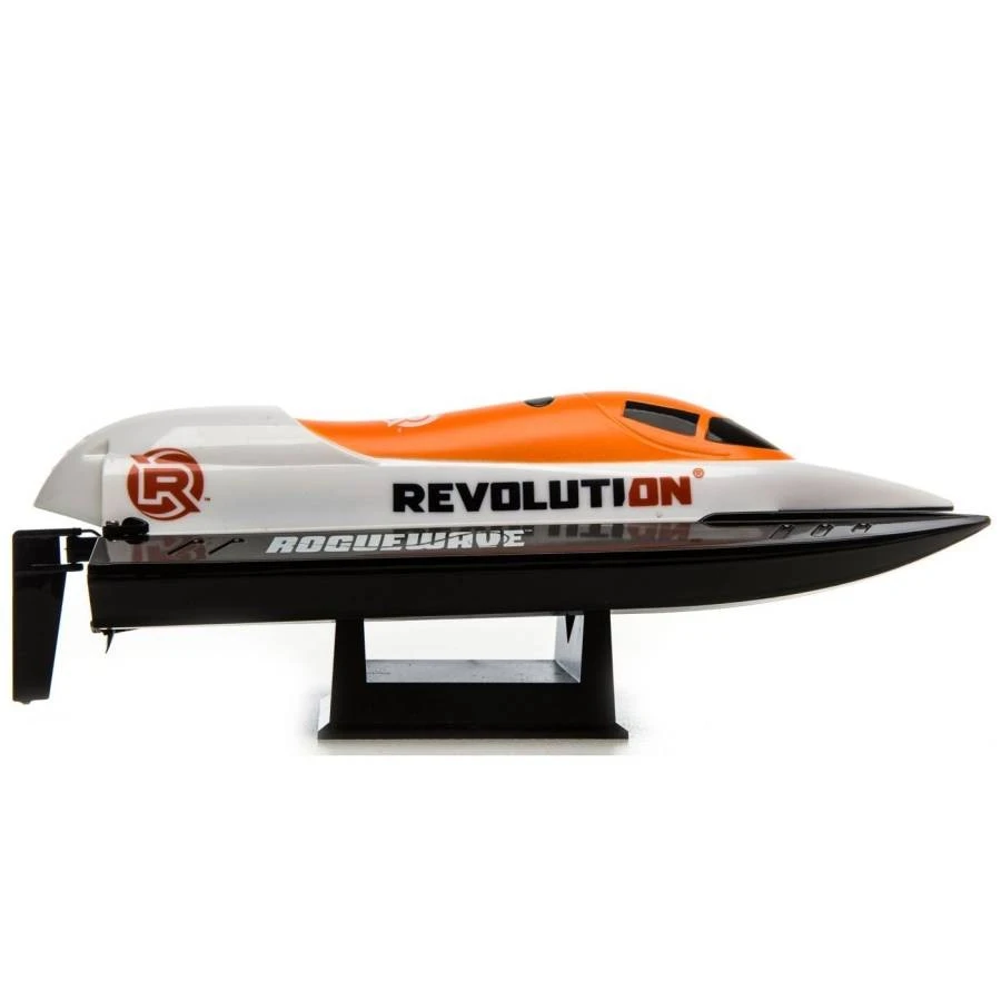 The Revolution® Roguewaveâ„¢ 10-inch self-righting F1 tunnel hull is a quick, nimble and durable electric boat that is perfect for pools or small ponds, and Ready-To-Run right out of the box. The impact resistant hull houses waterproof electronics like the speed control, steering servo and 2.4GHz receiver while the rechargeable battery offers zippy performance and good run times. But the awesome benefit of this boat is that you’ll never have to worry about capsizing. The Roguewave tunnel hull is designed with self-righting capability so it always flips upright no matter how much wake you make.