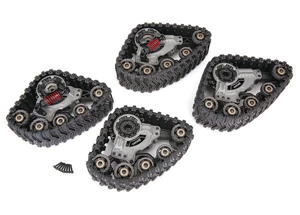 Each Traxx drive unit is engineered for rugged, yet smooth performance. An adjustable tension wheel keeps the treads tight while suspended road wheels allow the tread to conform to surface irregularities for maximum traction. Oil-filled dampers on each drive unit control rotational movements to help keep the tread glued to the surface. The rear Traxx drive units are longer to allow climbing steeper grades with authority.