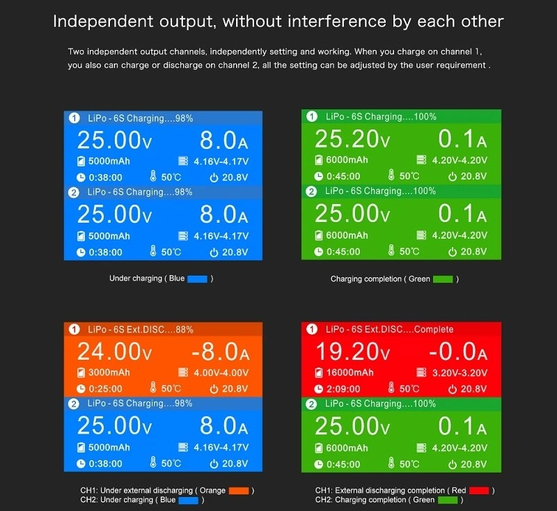 Charge Power:  DC Input: 2x200W, AC Input: Max.160W (CH1 + CH2)